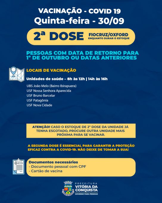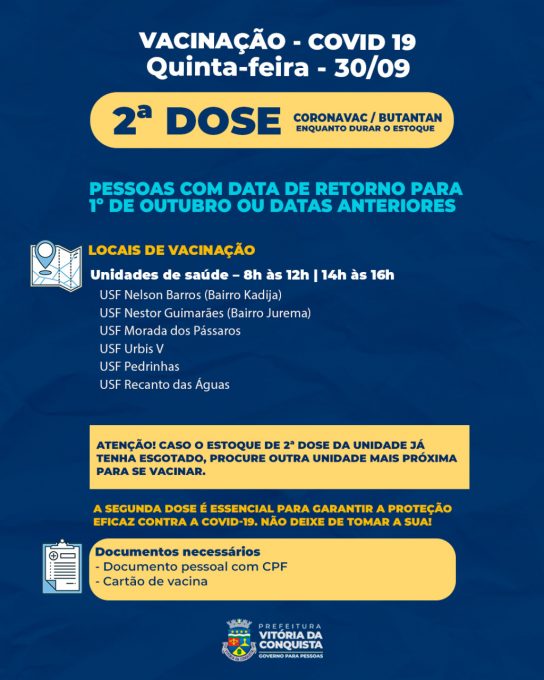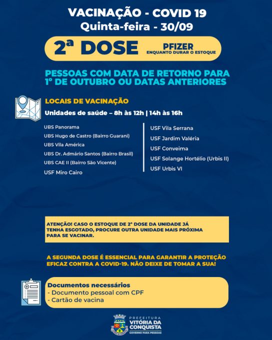 Já a 2ª dose estará disponível para aqueles que estão com data de retorno agendada para o dia 1º de outubro ou datas anteriores.