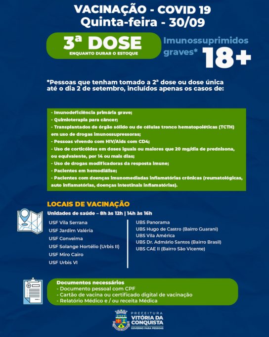 Poderão tomar a 3ª dose os idosos de 80 anos ou mais que tenham tomado a 2ª dose até o dia 30 de março e as pessoas com alto grau de imunossupressão, com 18 anos ou mais, que tomaram a 2ª dose até o dia 2 de setembro. Veja os locais: