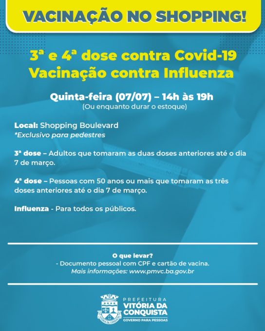 A Secretaria Municipal de Saúde (SMS) vai promover mais uma ação de vacinação no Shopping Boulevard, nesta quinta-feira (7), das 14h às 19h, contra a Influenza e 3ª e 4ª doses contra a Covid-19. As pessoas poderão tomar as duas vacinas, pois não é necessário intervalo entre elas.