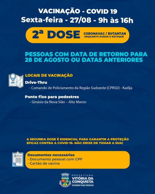 Na sede do município, a 2ª dose estará disponível para quem está com data de retorno agendada para o dia 28 de agosto ou datas anteriores. A aplicação da 2ª dose da CoronaVac/Butantan será das 9h às 16h, no drive-thru no Comando de Policiamento da Região Sudoeste (CPRSO), no bairro Kadija, e no ponto fixo para pedestres do Ginásio da Nova Sião, no bairro Alto Maron.