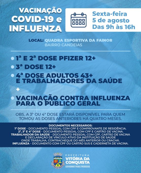 Nesta sexta-feira (5), haverá uma ação de vacinação contra a Covid-19 e contra Influenza na quadra esportiva da Fainor, no Bairro Candeias, com oferta de vacinas para adolescentes, adultos e trabalhadores da saúde. A vacinação será das 9h às 16h, ou enquanto durar o estoque.