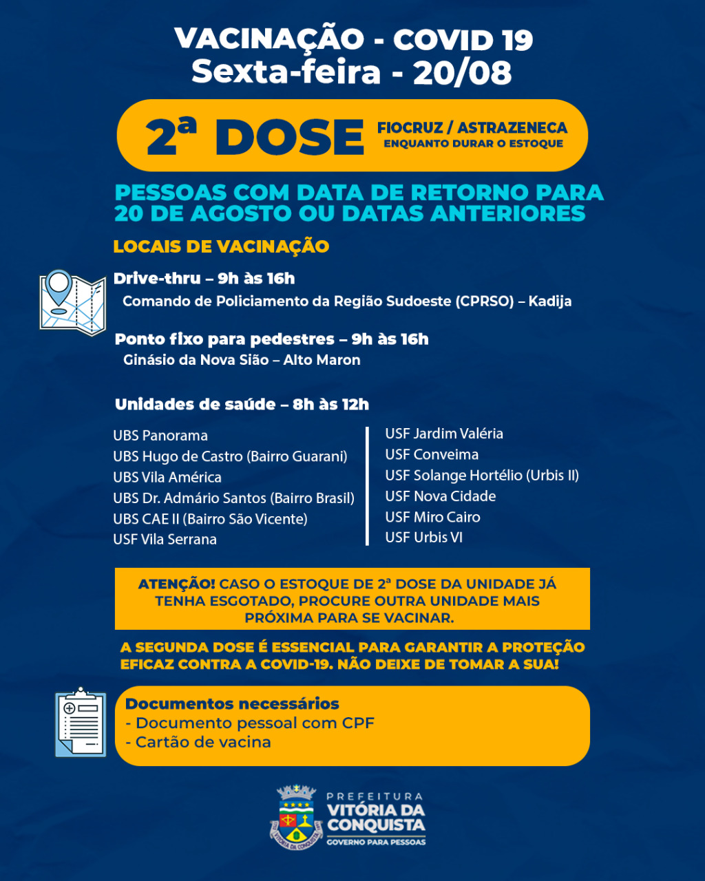 Nesta sexta-feira (20), haverá aplicação da 2ª dose apenas da vacina AstraZeneca/Fiocruz para quem tem retorno agendado para o dia 20 de agosto ou datas anteriores. A vacinação será nas unidades de saúde apenas no turno da manhã, das 8h às 12h. Esta é uma medida para evitar perdas de doses de frascos abertos no turno da tarde, pois as vacinas só têm validade de 48 horas após abertas e não há vacinação nas unidades aos sábados e domingos.