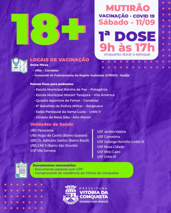 A 1ª dose também estará disponível, exclusivamente neste sábado, em 11 unidades de saúde: UBS Panorama, UBS Hugo de Castro (bairro Guarani), UBS Dr. Admário Santos (bairro Brasil), UBS CAE II (Bairro São Vicente), USF Vila Serrana, USF Jardim Valéria, USF Conveima, USF Solange Hortélio (Urbis II), USF Nova Cidade, USF Miro Cairo e USF Urbis VI.