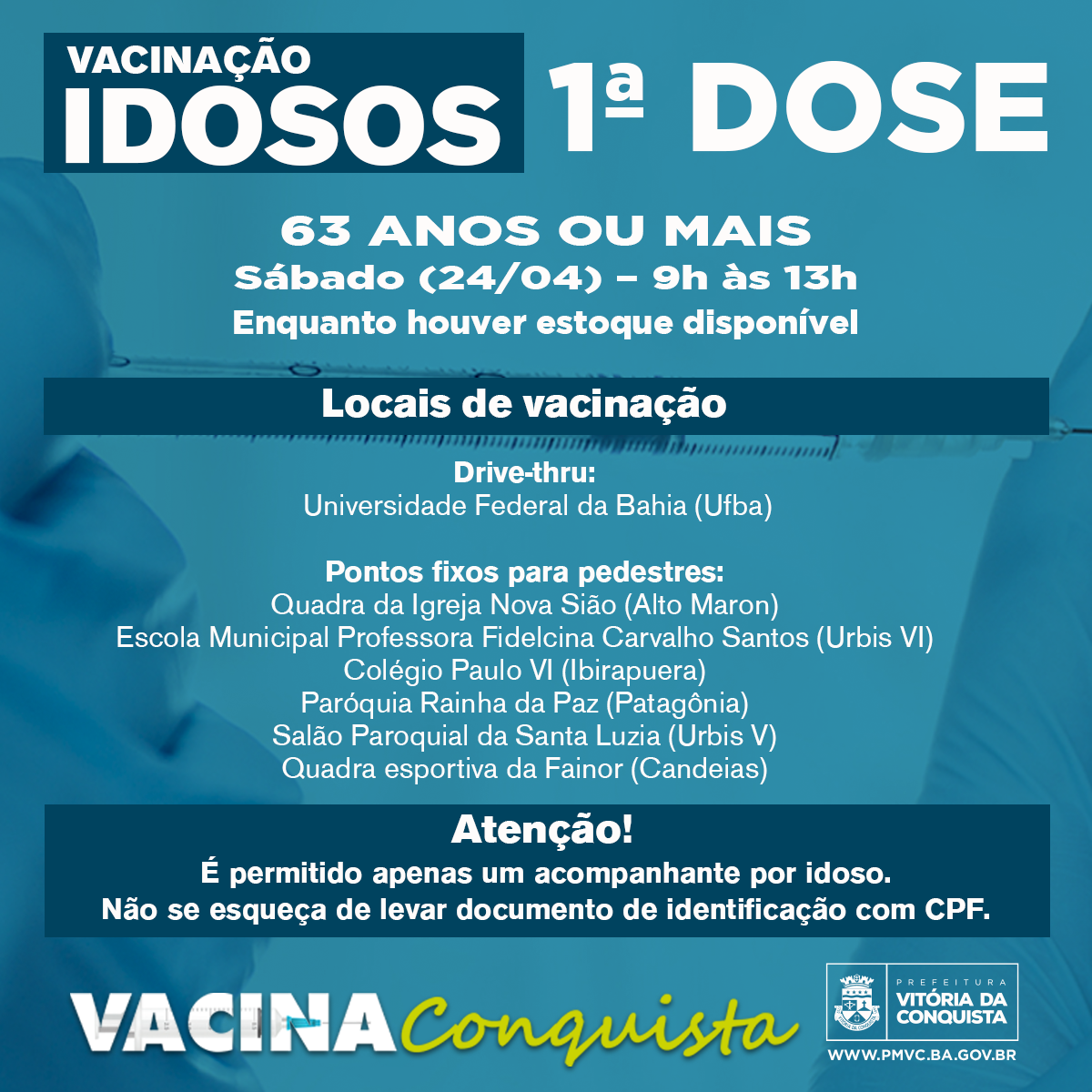 A Secretaria Municipal de Saúde (SMS) de Vitória da Conquista informa que, neste sábado (24), haverá vacinação da 1ª dose para quem tem 63 anos ou mais. Serão aplicadas 4.320 doses da AstraZeneca recebidas hoje. A vacinação começará das 9h e vai até 13h (enquanto houver estoque).