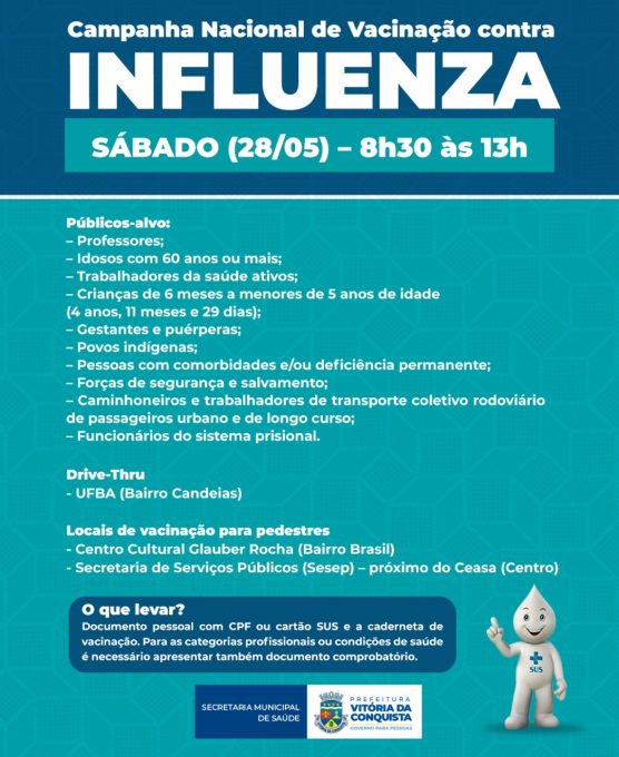 A ação será de 8h30 às 13h, com vacinação em drive-thru na Ufba, no bairro Candeias, e dois pontos para pedestres no Centro Cultural Glauber Rocha (bairro Brasil) e na Secretaria de Serviços Públicos (Sesep), próximo do Ceasa, no centro da Cidade.