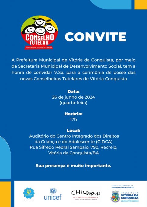 Acontece nesta quarta-feira (26), às 17 horas, no auditório do Centro Integrado dos Direitos da Criança e do Adolescente (Cidca), a cerimônia de posse das novas conselheiros tutelares. Ao todo, serão empossadas cinco novas conselheiras que irão atuar no Conselho Tutelar Zona 3, no quadriênio 2024-2028.