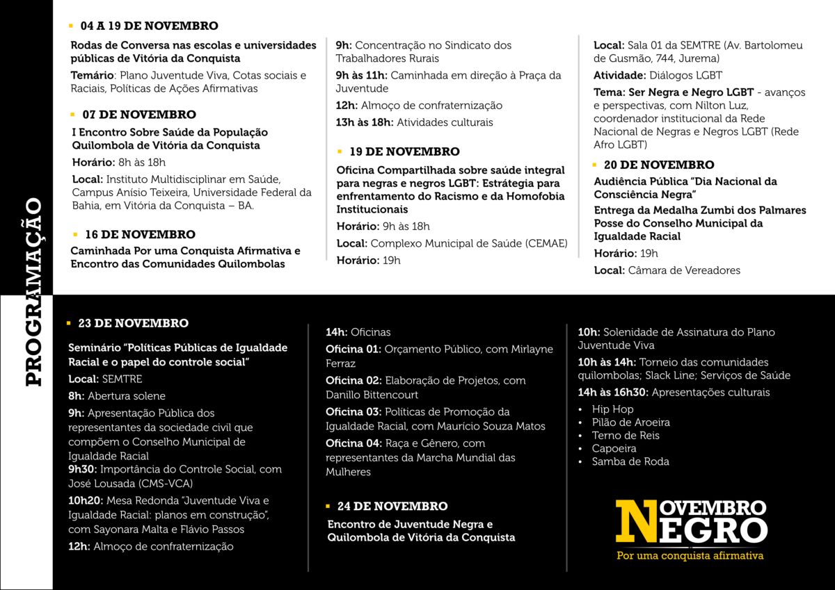 “O Novembro Negro: Por uma Conquista afirmativa segue no sentido inverso, pois traz o verdadeiro sentido da Consciência Negra: o debate, o diálogo, a cultura, a política, o ser negro”, salientou o assessor de Políticas para Igualdade Racial, Uelber Barbosa. As atividades começarão no dia 4 de novembro, com o lançamento da programação, seguido de rodas de conversa nas escolas públicas de Vitória da Conquista, com os temas Plano Juventude Viva, cotas sociais e raciais e políticas de ações afirmativas.