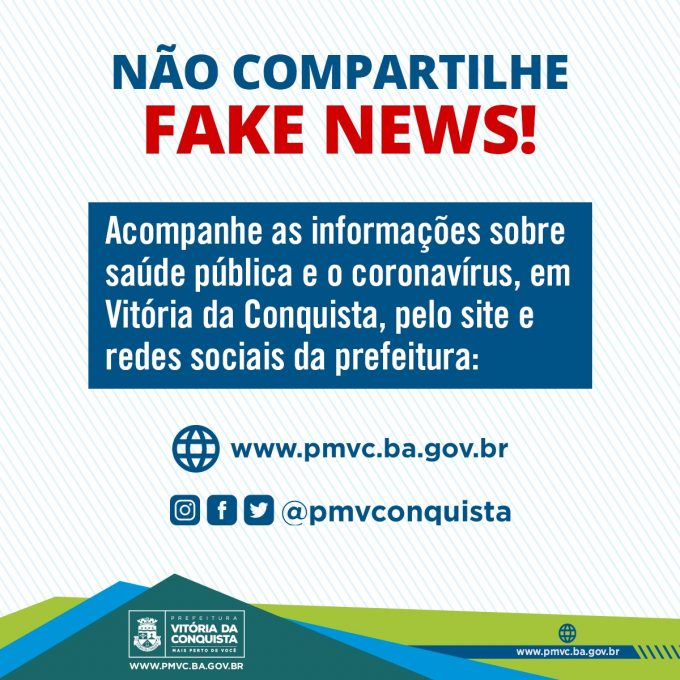Após o decreto da OMS sobre a pandemia de Coronavírus, muitas notícias falsas estão circulando em Vitória da Conquista. É importante alertar a população de que TODAS as informações referentes a suspeitas de casos no município estão sendo disponibilizadas, primeiramente, no site da Prefeitura e em suas redes sociais.