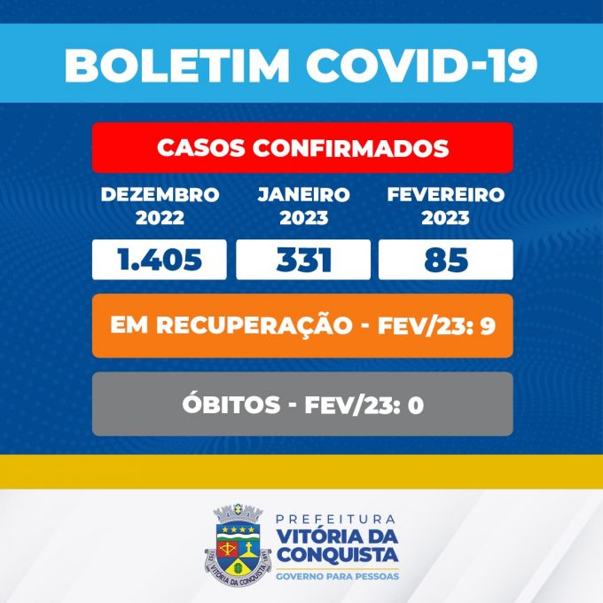 A Covid-19 segue em queda em Vitória da Conquista. O número de casos confirmados caiu pelo segundo mês consecutivo, de acordo com boletim mensal da Secretaria Municipal de Saúde (SMS), que registrou 85 casos confirmados em fevereiro.