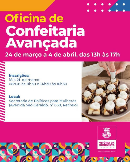 A Secretaria Municipal de Políticas para Mulheres (SMPM), por meio da Coordenação de Autonomia e Políticas Transversais para Mulheres, abriu as inscrições para a Oficina de Confeitaria Avançada até esta sexta-feira (21).