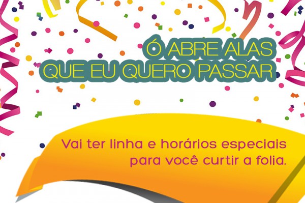 Para atender ao público que participará do Carnaval Conquista Cultural, algumas linhas de ônibus terão os horários estendidos. Entre os dias 14 e 17 de fevereiro, os ônibus que fazem as linhas Vilas Serranas, Cidade Maravilhosa, Patagônia, Conquista VI e Rodoviária, todas com destino ao Centro, circularão até às 2h. Durante os dias da festa também será disponibilizada linha especial que atenderá aos moradores do bairro Brasil.