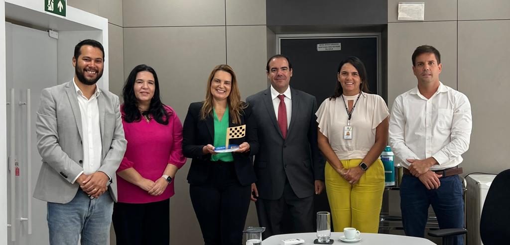Prefeita Sheila Lemos com o prêmio conquistado em 2022. Da esq. para a dir.: Mateus Novais; Thaisy Gusmão; Rafael Figueiredo; Gabriela Neiva e Rodrigo Giudice (os três da CGU)