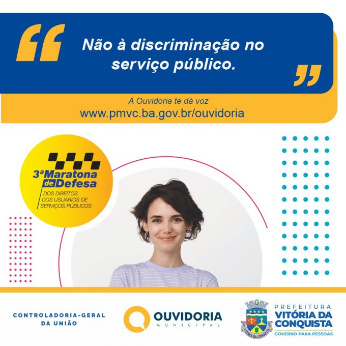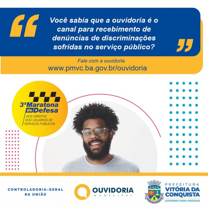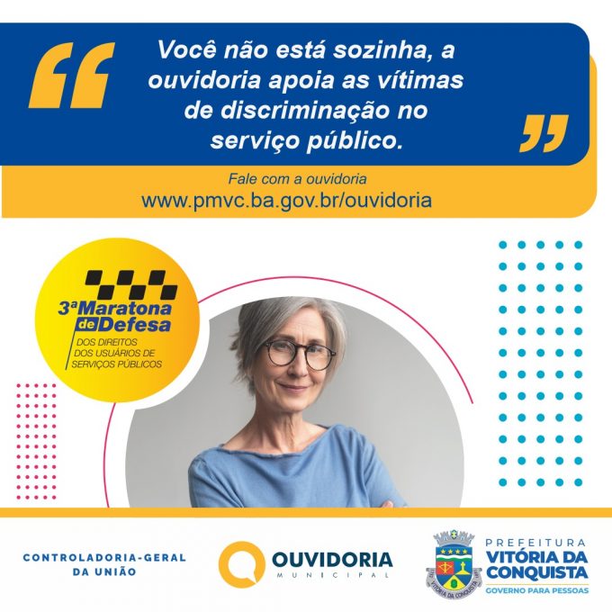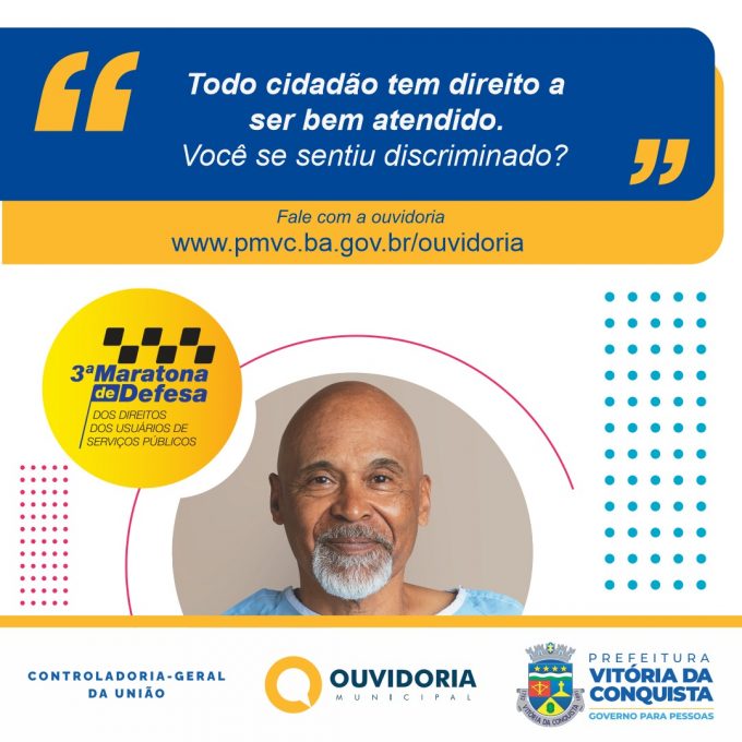 Entre os dias 31 de julho e 10 de agosto, a Ouvidoria-Geral de Vitória da Conquista estará presente nas redes sociais da Prefeitura e em espaços publicitários de emissoras de rádio e televisão para divulgar conteúdos informativos sobre a 3ª edição da Maratona de Defesa dos Direitos dos Usuários de Serviços Públicos.