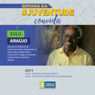 O palestrante será o militante do movimento negro, Zulu Araújo, que atuou como diretor de Cultura e conselheiro do Grupo Cultural Olodum por 10 anos. Atualmente, ele dirige a Fundação Pedro Calmon – órgão vinculado à Secretaria de Cultura do Estado da Bahia.