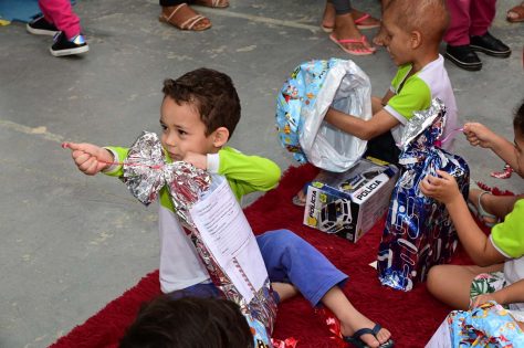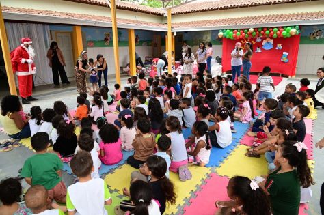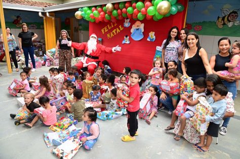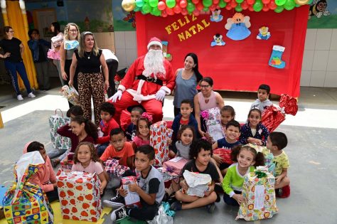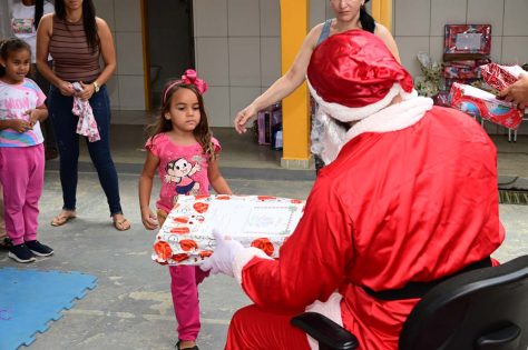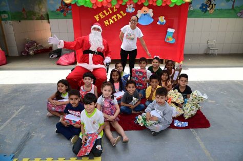 Alunos do Centro Municipal de Educação Infantil (CMEI) Senhorinha Cairo tiveram uma manhã diferente nesta quarta-feira (4). É que eles receberam a visita do Papai Noel, que entregou brinquedos aos 220 alunos de 2 a 5 anos atendidos pela instituição.