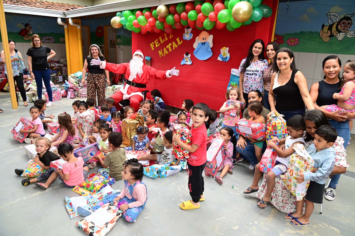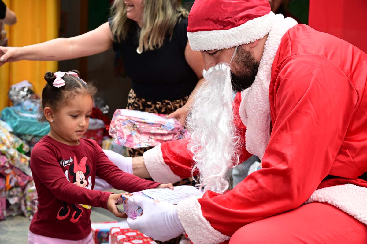 Alunos do Centro Municipal de Educação Infantil (CMEI) Senhorinha Cairo tiveram uma manhã diferente nesta quarta-feira (4). É que eles receberam a visita do Papai Noel, que entregou brinquedos aos 220 alunos de 2 a 5 anos atendidos pela instituição.
