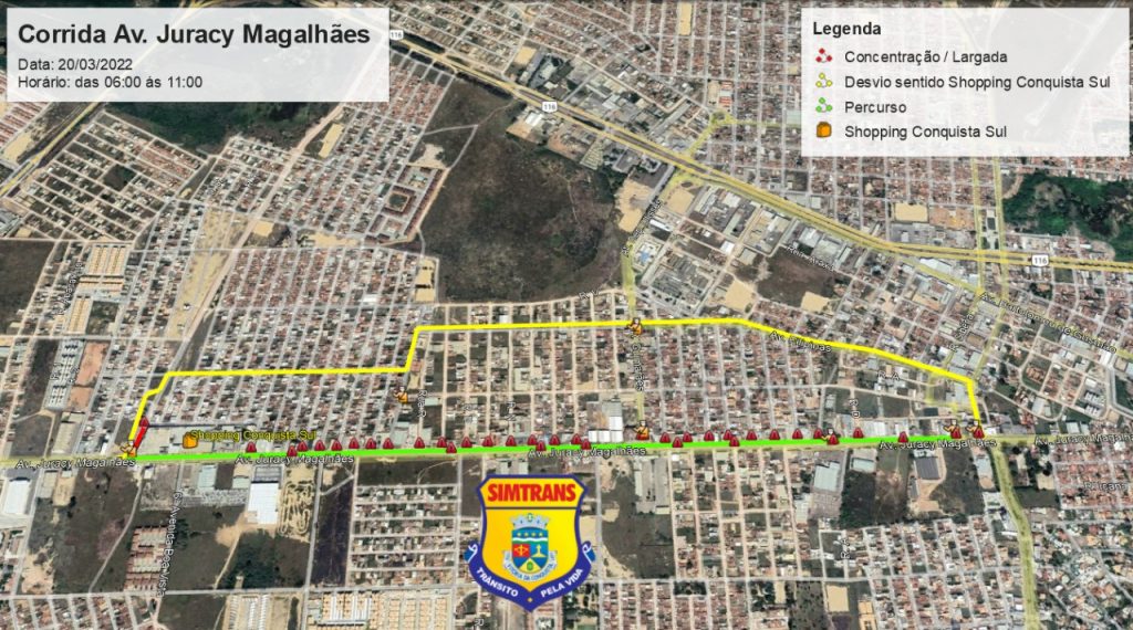 A Prefeitura de Vitória da Conquista, por meio da Secretaria Municipal de Mobilidade Urbana, informa que, no domingo (20), a avenida Juracy Magalhães será interditada no sentido Centro – Shopping Conquista Sul, das 6h às 12h, para que seja realizada a Corrida nas Ruas de Conquista.