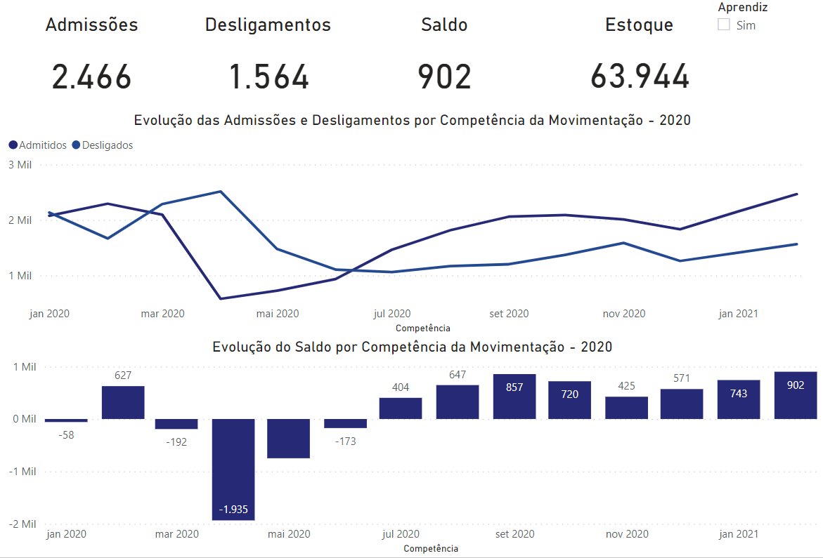 Mesmo com a pandemia, Vitória da Conquista mantém, desde julho do ano passado, tendência de crescimento na geração de empregos formais. Em fevereiro deste ano, o município apresentou o melhor resultado dos últimos oito meses, com saldo de 902 empregos: foram admitidos 2.466 trabalhadores e trabalhadoras com carteira assinada e foram desligados 1.564. Isso representa um crescimento de 34% em comparação a janeiro, cujo saldo foi 671, e 51% acima de fevereiro do ano passado.
