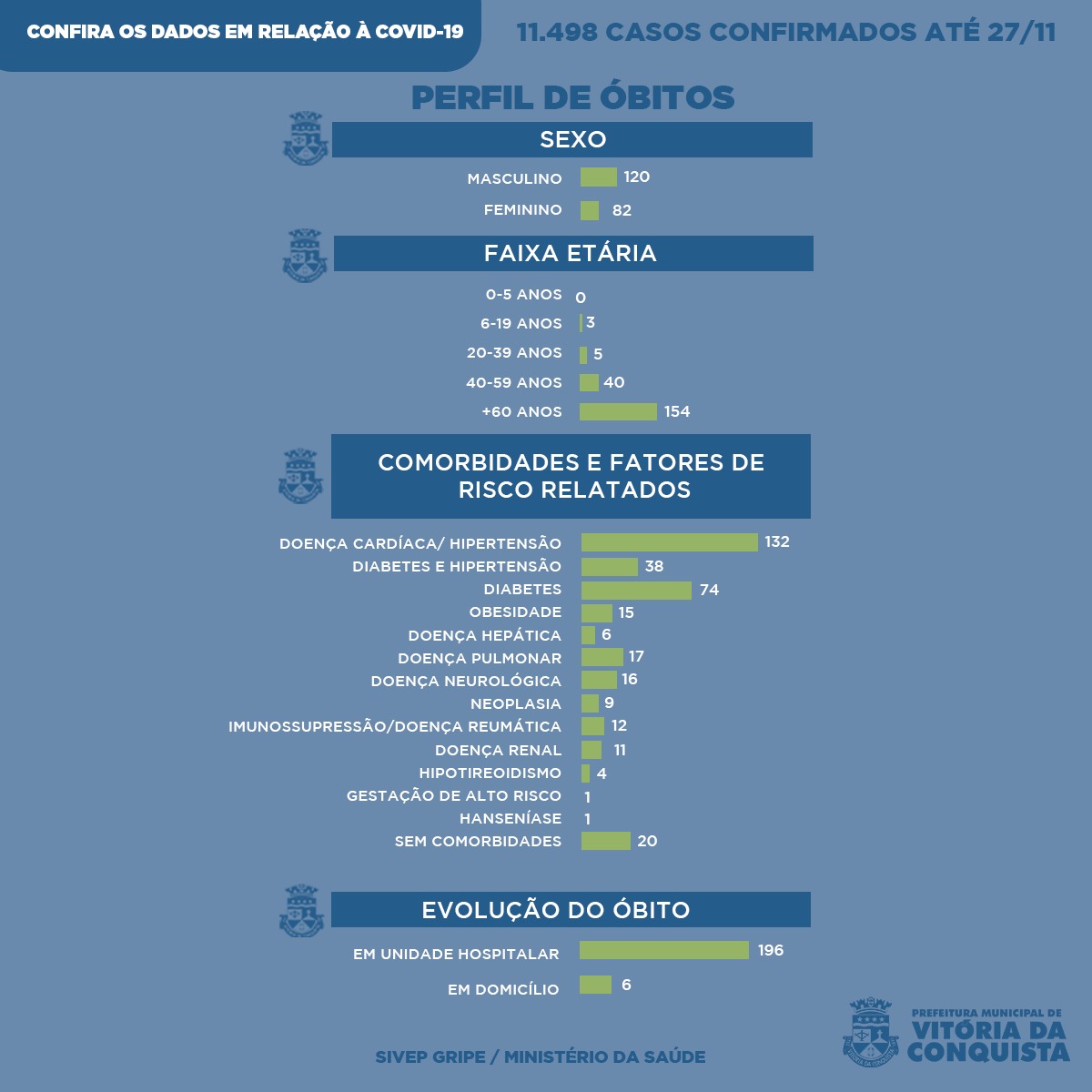 O município registrou 202 óbitos, por complicações decorrentes da Covid-19, até essa sexta-feira (27). Desses pacientes, 82 eram do sexo feminino; e 120, do sexo masculino. Além disso, 154 deles tinham mais de 60 anos; 40 estavam na faixa etária de 40 a 59 anos; cinco apresentavam de 20 a 39 anos; e três possuíam entre seis e 19 anos. Foram registrados 196 falecimentos em unidade hospitalar e seis em domicílio.