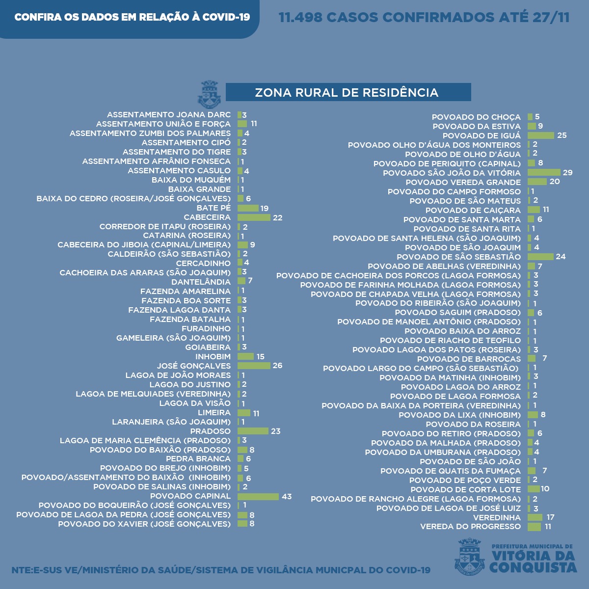 Na zona urbana de Vitória da Conquista, foram registrados 10.935 pacientes da Covid-19, moradores das seguintes localidades: