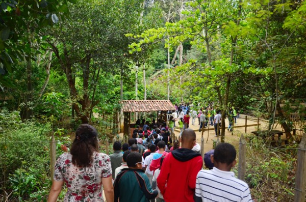 Na manhã desta quarta-feira, 30, o Poço Escuro recebeu a visita de crianças e adolescentes da Escola Municipal Mãe Vitória de Petu e do Colégio Dinâmico. Os alunos que estiveram presentes na mata são de séries que vão desde o 5º ao 1º ano do ensino médio. Quem esteve presente na atividade se surpreendeu com o que viu. “Gostei muito das plantações e vou prestar bastante atenção para aprender muito”, contou a estudante Mirele Pereira, 11 anos.