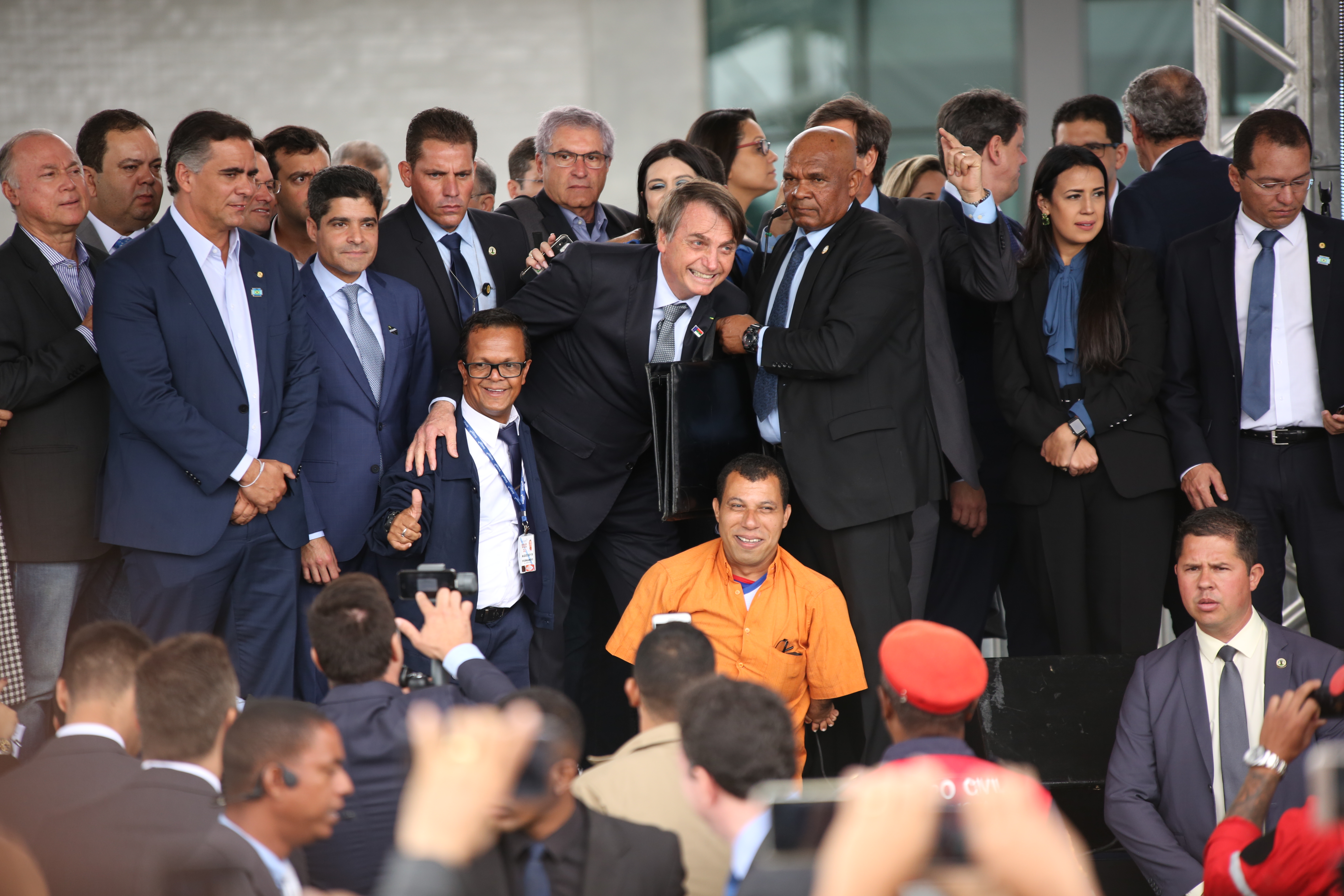 Givanildo Ribas ( camisa laranja) teve a honra de subir ao palco e cumprimentar de perto o Presidente Jair Bolsonaro