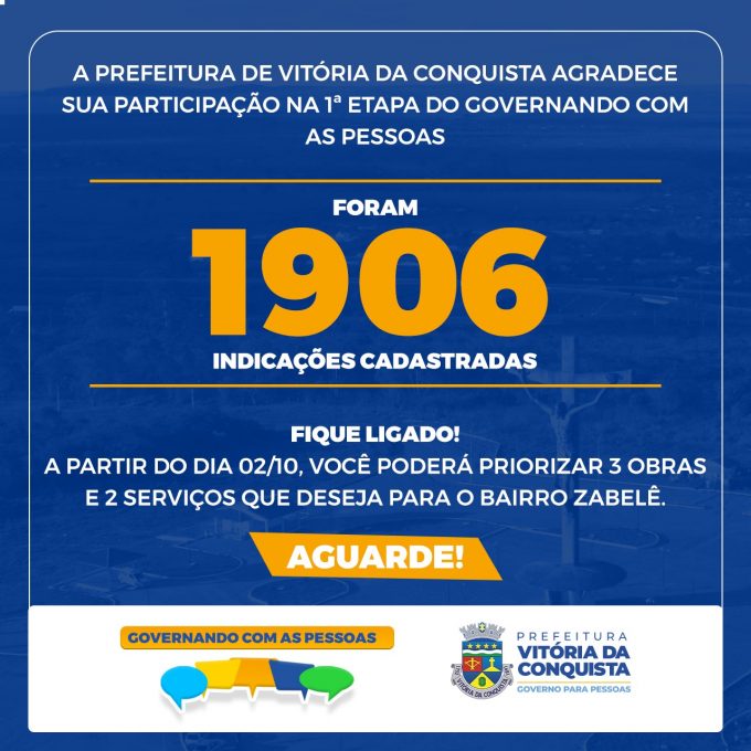 O Governando com as Pessoas recebeu, na primeira etapa de votação, 1.906 indicações dos moradores e trabalhadores do bairro Zabelê – escolhido para iniciar o projeto-piloto da Prefeitura de Vitória da Conquista. A primeira etapa foi concluída na última sexta-feira (15).