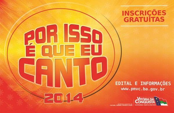 Com a proposta de dar visibilidade a novos artistas, democratizando a arte e a cultura no município, a Prefeitura de Vitória da Conquista, por meio da Secretaria Municipal de Cultura, Turismo, Esporte e Lazer, torna público o Edital nº 05/2014 de seleção de intérpretes musicais para o Concurso Cultural Por isso é que eu canto – edição 2014.