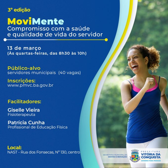 Já estão abertas as inscrições para a 3ª edição do programa MoviMente, promovido pelo Núcleo de Atenção à Saúde e Segurança do Trabalho (Nast). O programa tem como objetivo estimular os servidores para a prática de exercícios físicos, promovendo bem-estar e saúde.
