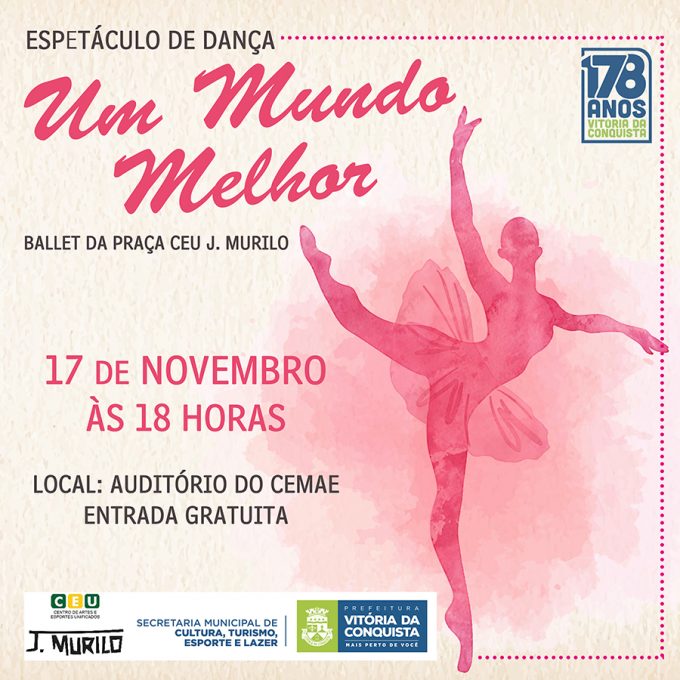 Um mundo melhor é possível? Claro que é! E é isso que o grupo de ballet da Praça CEUs J. Murilo vai mostrar no próximo dia 17 de novembro, através da dança, no espetáculo “Um mundo melhor”. Fruto de um intenso trabalho, os integrantes do ballet, crianças e adultos, expressarão através da dança, da música e da poesia a compreensão e os anseios frente à dinâmica dos valores impressos na humanidade.