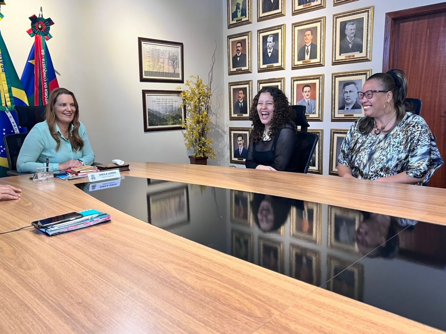 A prefeita Sheila Lemos recebeu em seu gabinete, essa semana, uma visita especial que vem encantando o Brasil: a jovem cantora Mina. A artista de Vitória da Conquista arrebatou corações e conquistou seu lugar na grande final do renomado programa de talentos “Canta Comigo Teen”, que acontece no dia 17 de setembro, às 17h, na TV Record.