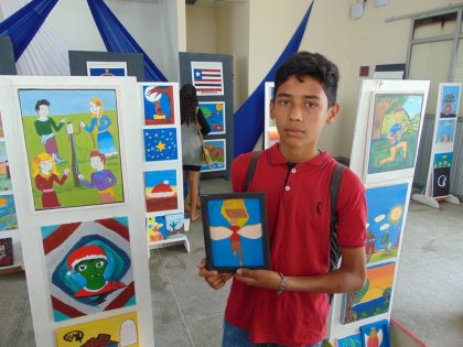 Aluno da Escola Municipal Edivanda Maria Teixeira, Samuel Chaves, de 15 anos, participou da Oficina. Uma de suas obras esteve na exposição, e as outras foram levadas para compor a árvore de Natal montada com algumas dessas telas, na entrada da Prefeitura. “Eu acho uma coisa bem legal, porque além de tudo, estou desde o ano passado e nunca tive vontade de parar. No que vem, com fé em Deus, eu vou vir. Graças à professora Edméia, eu pude abrir os horizontes, ver outras coisas, ver o mundo diferente”, avalia.