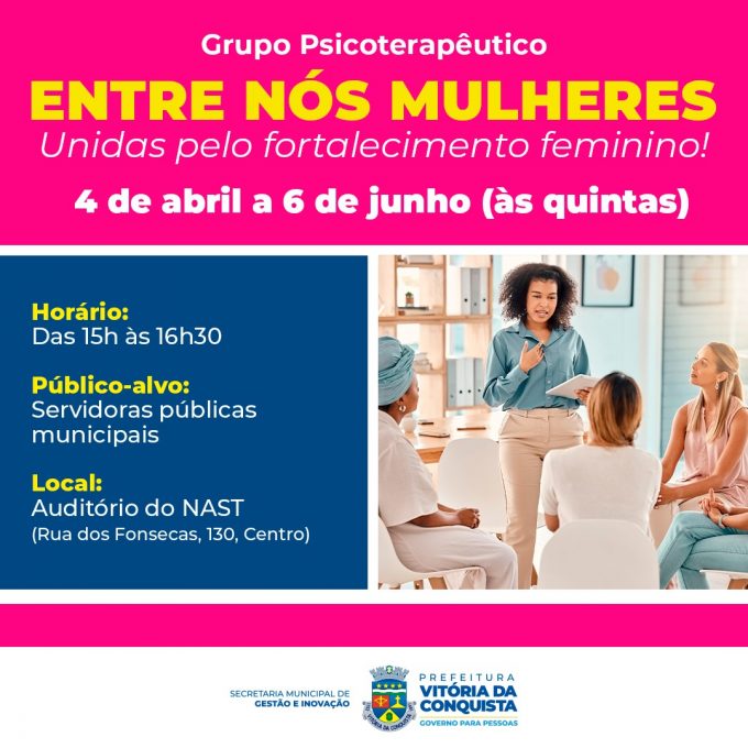 A Prefeitura de Vitória da Conquista, por meio da Secretaria de Gestão e Inovação (Semgi) vai iniciar o grupo terapêutico “Entre Nós Mulheres”, voltado para as servidoras, públicas municipais.