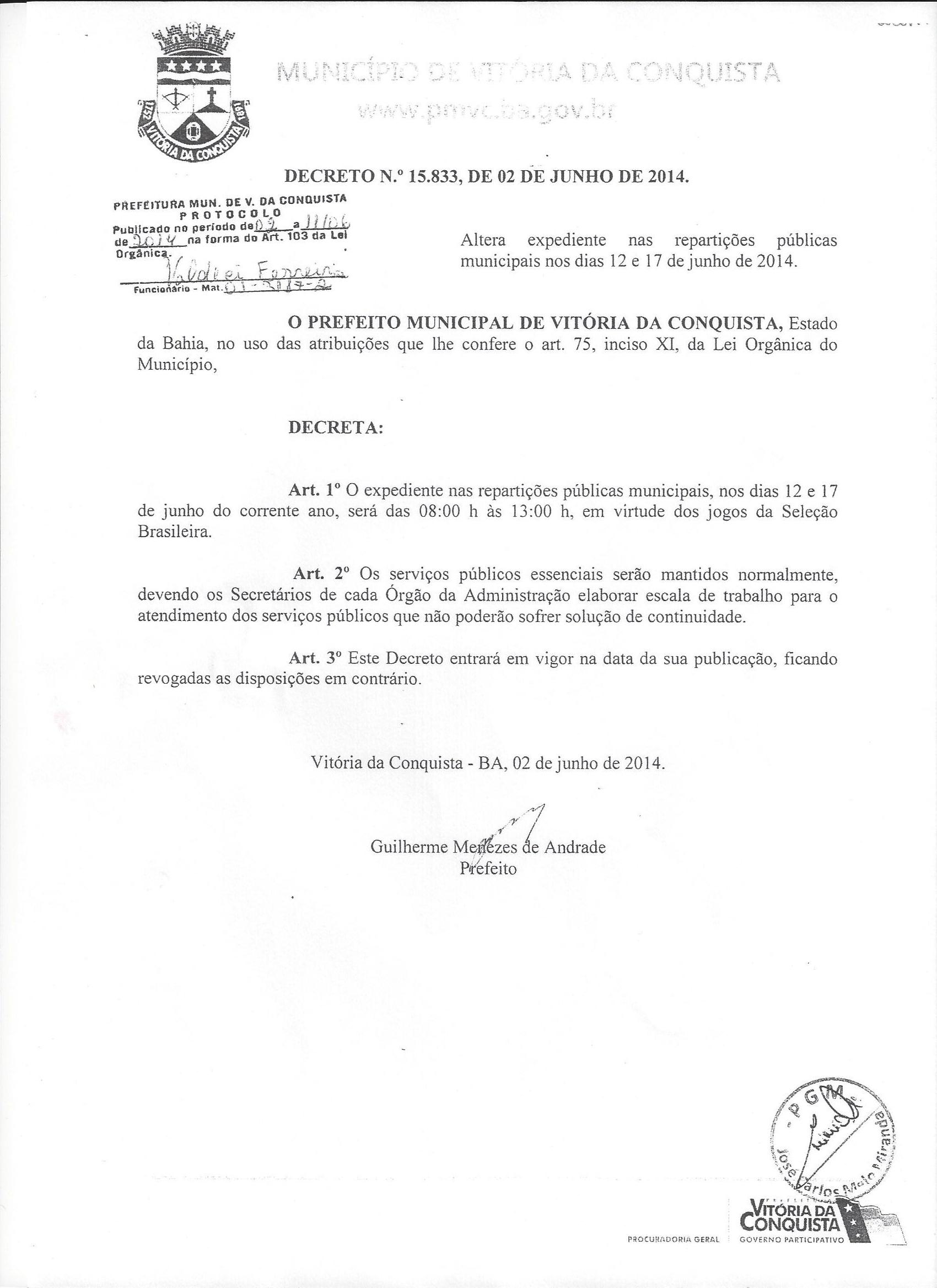 A Prefeitura de Vitória da Conquista, por meio do Decreto nº 15.833, informa que o expediente nas repartições públicas municipais nos dias 12 e 17 de junho será das 8h às 13h, em virtude dos jogos da Seleção Brasileira. Os serviços públicos essenciais serão mantidos normalmente.