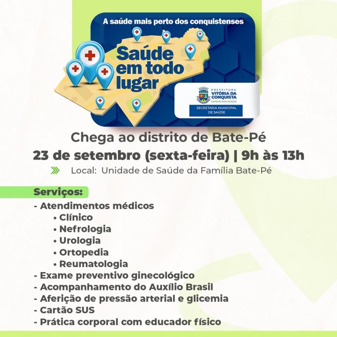 A comitiva do projeto Saúde em Todo Lugar voltará, nesta sexta-feira (23), ao distrito de Bate-Pé, levando mais atendimentos de saúde para a comunidade. A ação será das 9h às 13h, na unidade de saúde da localidade, e os agentes de saúde já estão convidando os moradores para participarem.