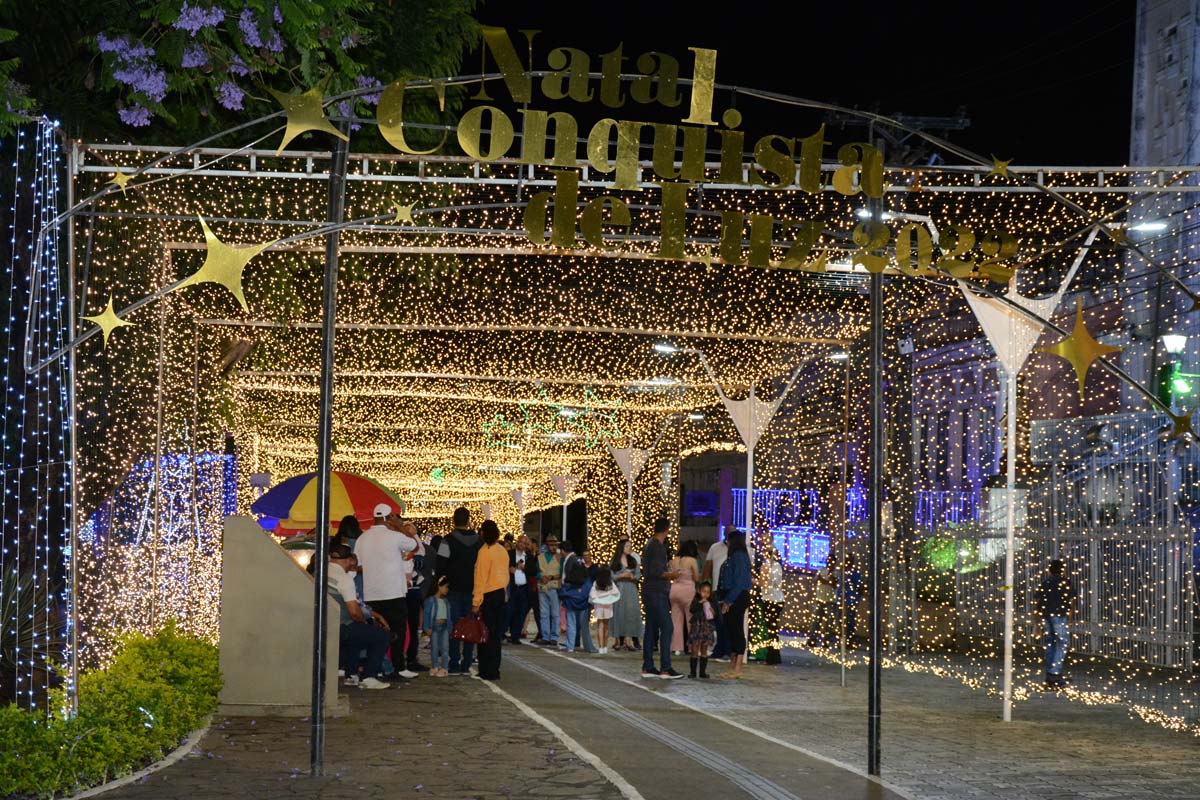 Conforme a tradição, a iluminação especial do Natal Conquista de Luz segue até 6 de janeiro, dia de Santos Reis, que também foram lembrados na noite deste domingo com a apresentação do terno de reis Estrela d’Alva, do loteamento Jardim Copacabana II.