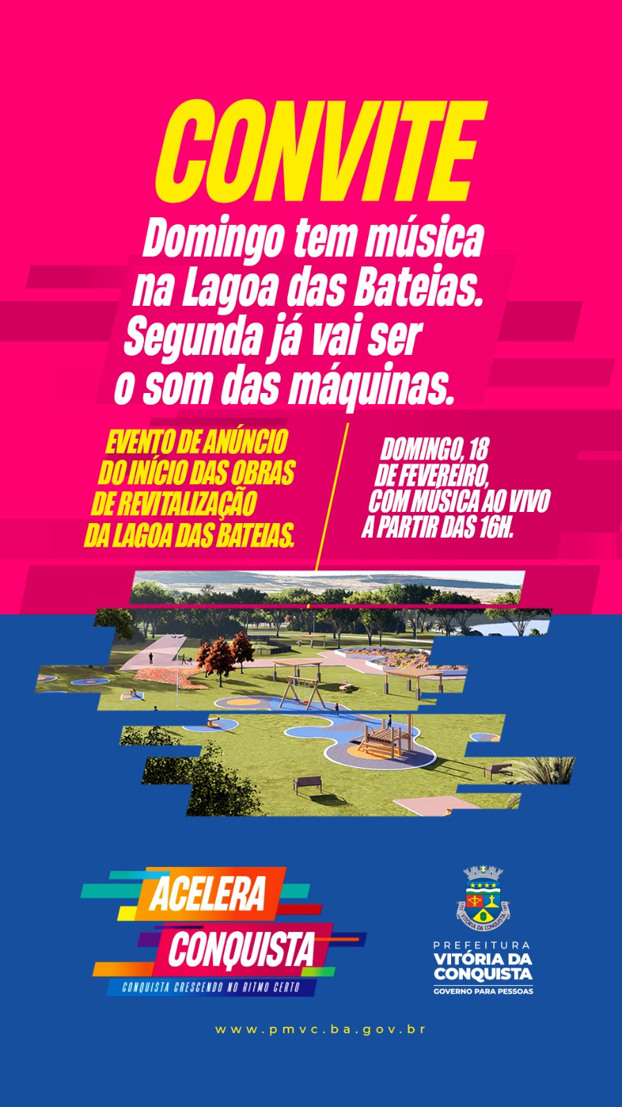 Neste domingo (18), às 16h, na Lagoa das Bateias, o Governo Municipal vai anunciar oficialmente o início da segunda etapa da reurbanização da área do parque, considerado um dos principais cartões-postais de Vitória da Conquista.