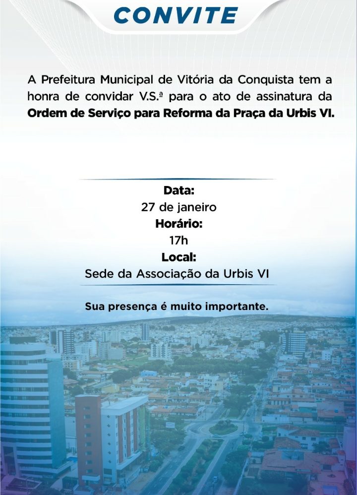 As obras serão realizadas na Praça, situada na área verde da Urbis VI, no bairro Espírito Santo, conforme contrato firmado com a Empresa Municipal de Urbanização de Vitória da Conquista (Emurc).