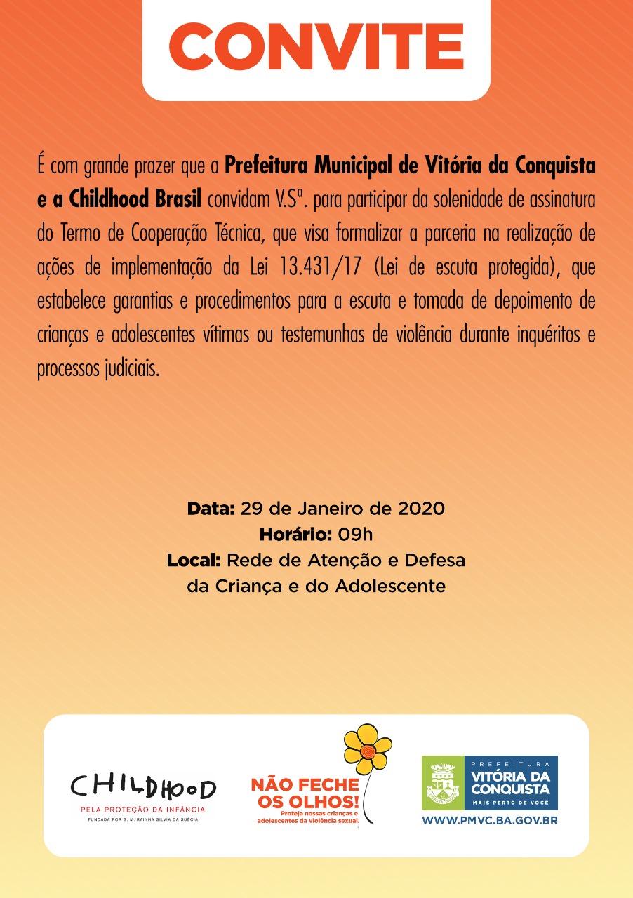 Vitória da Conquista foi escolhida pela Childhood Brasil como parceira na realização de ações referenciais relacionadas à implementação da Lei 13.431/2017, que visa à assistência de crianças e adolescentes vítimas ou testemunhas de violência durante inquéritos, processos judiciais ou proteção social. A parceria busca aprimorar procedimentos e metodologias no âmbito do município, especialmente o atendimento integrado e a escuta especializada. A assinatura do termo de cooperação técnica acontecerá, no dia 29 de janeiro, às 9h, na Rede de Atenção e Defesa da Criança e do Adolescente, com a presença de representantes da Childhood Brasil e do prefeito Herzem Gusmão.