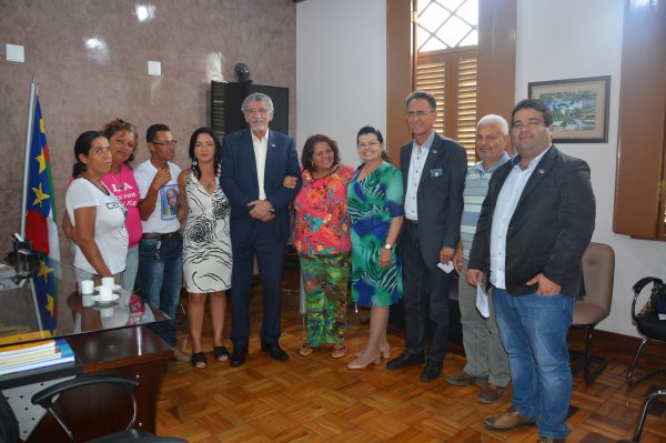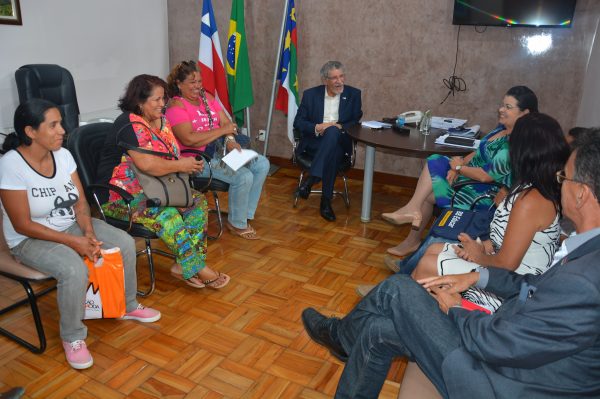 O prefeito Herzem Gusmão se reúne com representantes da Associação de Feirantes do Vila América. Na foto, também aparecem a vereadora Lúcia Rocha (de vestido verde); o secretário de Mobilidade Urbana, Esmeraldino Correia (à esquerda da vereadora); e o secretário de Serviços Públicos, Ivan Cordeiro (primeiro da esquerda para a direita)