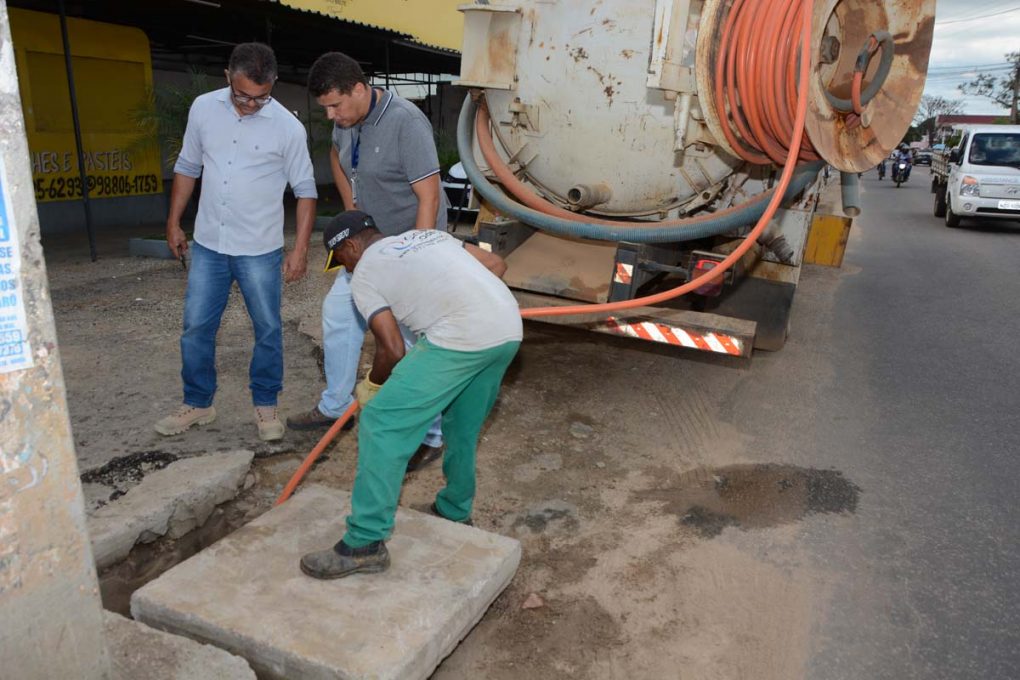 Equipe da Seinfra utiliza caminhão pressurizado para tentar desobstruir rede de drenagem