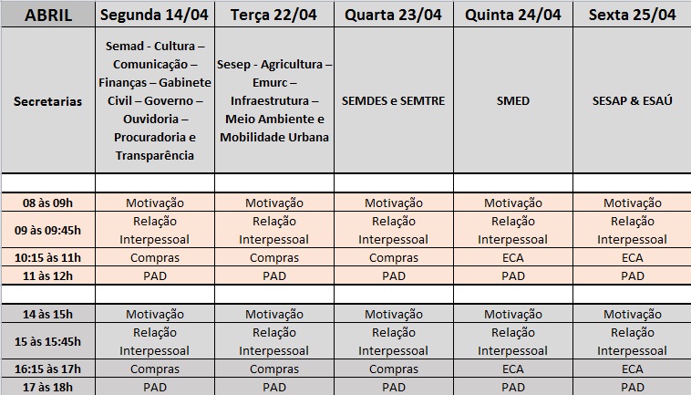 Servidores de todas as secretarias municipais e funcionários da Fundação Municipal de Saúde participarão nos dias 14, 22, 23, 24 e 25 de abril do 1º Ciclo de Palestras da Prefeitura Municipal de Vitória da Conquista. A atividade acontecerá no auditório da Faculdade Independente do Nordeste (Fainor). A proposta do Governo Municipal é seguir com o cronograma de atividades, com ênfase na valorização e qualificação do servidor.