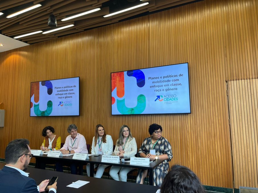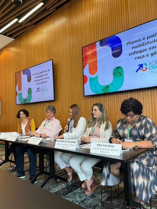 Sheila Lemos participou da mesa de discussão “Planos e Políticas de Mobilidade com enfoque em classe, raça e gênero”, que apresentou as ações positivas desenvolvidas nos municípios para tornar o transporte público urbano mais democrático, humano e acessível. Ao seu lado, discursaram a chefe de Cooperação Internacional de Barcelona, na Espanha, e os representantes de Belém, no Pará; Palmas, no Tocantins, e Contagem, em Minas Gerais.