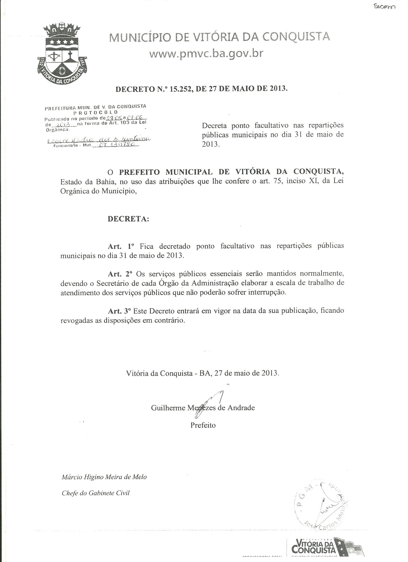 A Prefeitura de Vitória da Conquista decretou ponto facultativo nas repartições públicas municipais na próxima sexta-feira, 31. Os serviços públicos essenciais serão mantidos normalmente. Clique aqui e confira o Decreto.