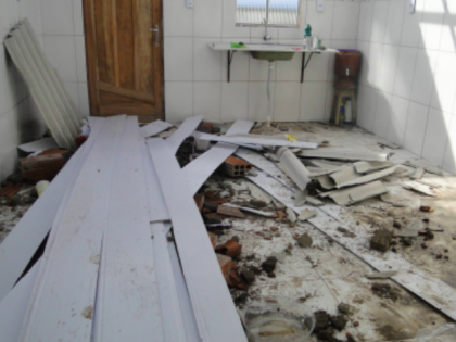 Uma das famílias que teve prejuízos com as fortes chuvas foi a de Gileno Pacheco e sua esposa, Maria Aparecida. Com os ventos que acompanharam a tempestade, a casa em que eles moram com os dois filhos pequenos foi completamente destelhada. “A gente ficou no desespero, não podia sair porque o vento tava muito forte, com relâmpagos e caindo raios, e a gente não podia fazer nada. Deus abençoou que em uma hora, uma hora e vinte, passou; mas foi um terror”, conta Gileno.