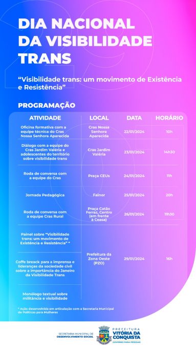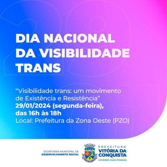 Como forma de celebrar o Dia Nacional da Visibilidade Trans, a Prefeitura de Vitória da Conquista, por meio da Secretária Municipal de Desenvolvimento Social (Semdes) e da Coordenação de Promoção da Cidadania e Direitos de LGBT, realizará na próxima segunda-feira (29) um painel sobre a visibilidade trans: “Um movimento de Existência e Resistência”. A ação vai acontecer na Prefeitura da Zona Oeste, localizada no Centro Cultural Glauber Rocha, a partir das 16h, e contará com a participação de integrantes dos movimentos sociais e da comunidade trans, para discutir a importância das mobilizações durante o mês de Janeiro, voltados à visibilização das pautas da população transexual e travesti.