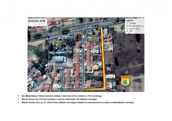- Tanto no Sábado quanto no Domingo, o trânsito na Rua A será EXCLUSIVO de moradores e veículos credenciados TRE; a Rua B terásentido único para Av. Olivia Flores e será proibido o estacionamento de veículos em ambos os lados da via.