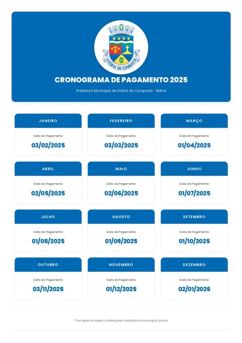 A Prefeitura de Vitória da Conquista, por meio da Secretaria Municipal de Gestão e Inovação (Semgi), divulga o cronograma com as datas de pagamento dos funcionários públicos municipais neste ano de 2025. A medida tem como objetivo garantir que os servidores possam se programar financeiramente ao longo do ano.