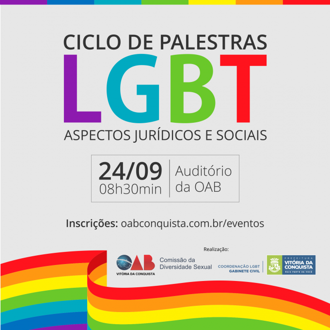 A fim de promover o debate em torno das questões legais e sociais que envolvem a comunidade LGBT, bem como a criação de leis municipais em prol da proteção desse público, a Prefeitura Municipal, em parceria com a Ordem dos Advogados (OAB) de Vitória da Conquista, promoverá o Ciclo de Palestras LGBT – Aspectos Jurídicos e Sociais. O evento acontecerá no dia 24 de setembro, das 8h30 à uma hora da tarde, no auditório da OAB (Rua Rotary Club, 103 – Centro).
