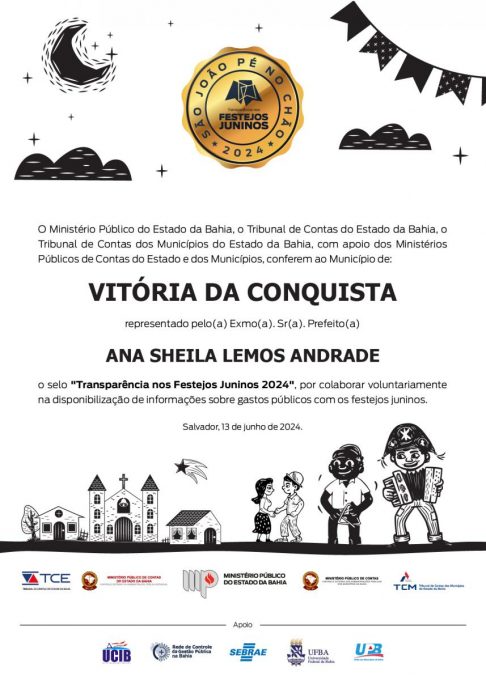 A cidade de Vitória da Conquista foi contemplada com o Selo “São João Pé no Chão” de transparência nos festejos juninos. O Selo é uma iniciativa do Ministério Público do Estado (MPE/BA), com os tribunais de contas e órgãos de controladoria da Bahia, e serve para incentivar boas práticas nos contratos referentes aos festejos juninos.